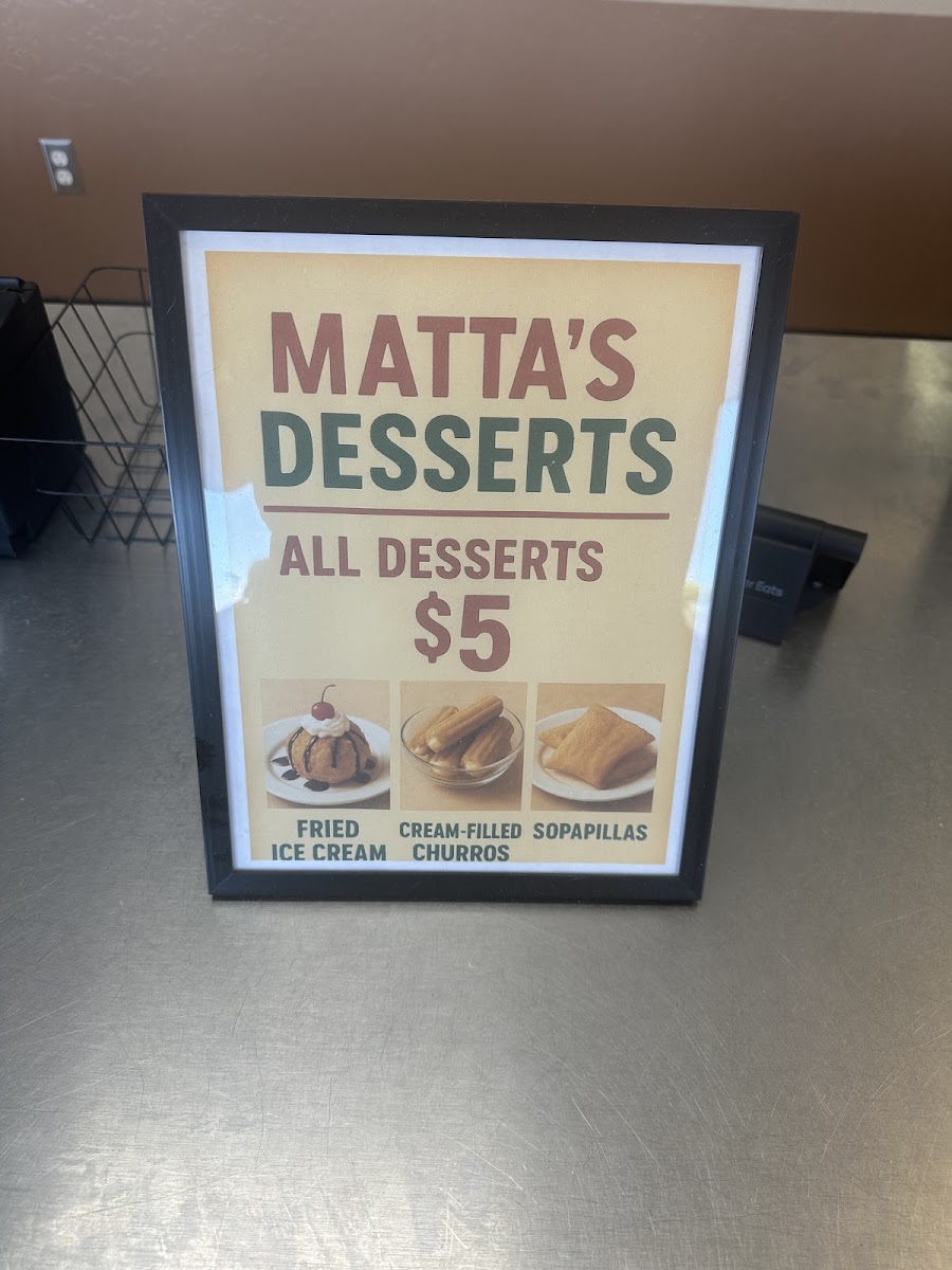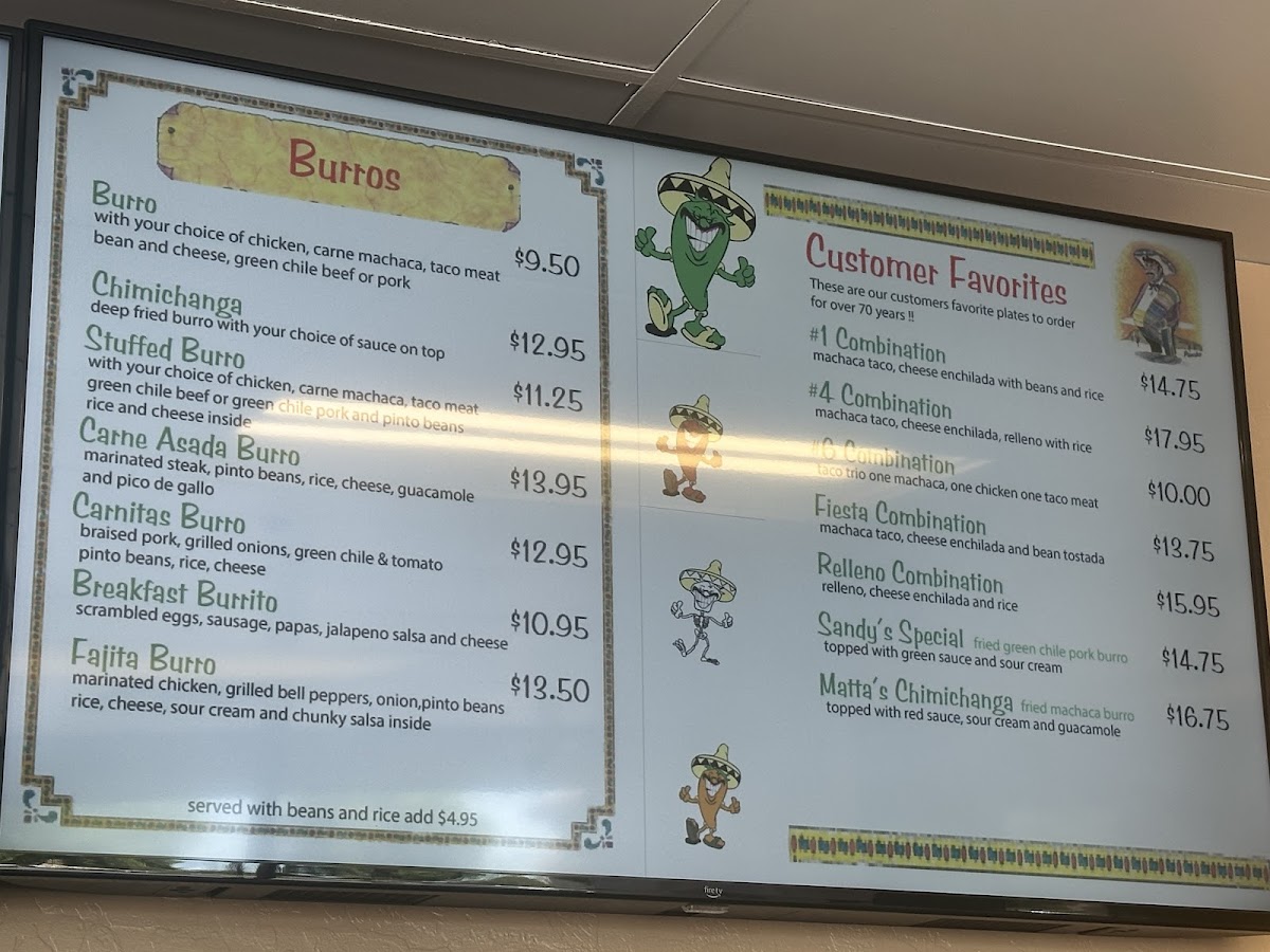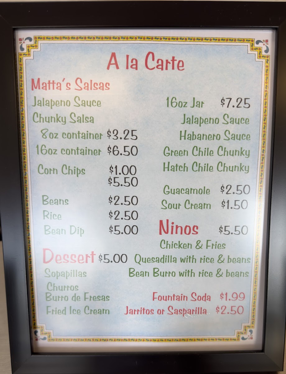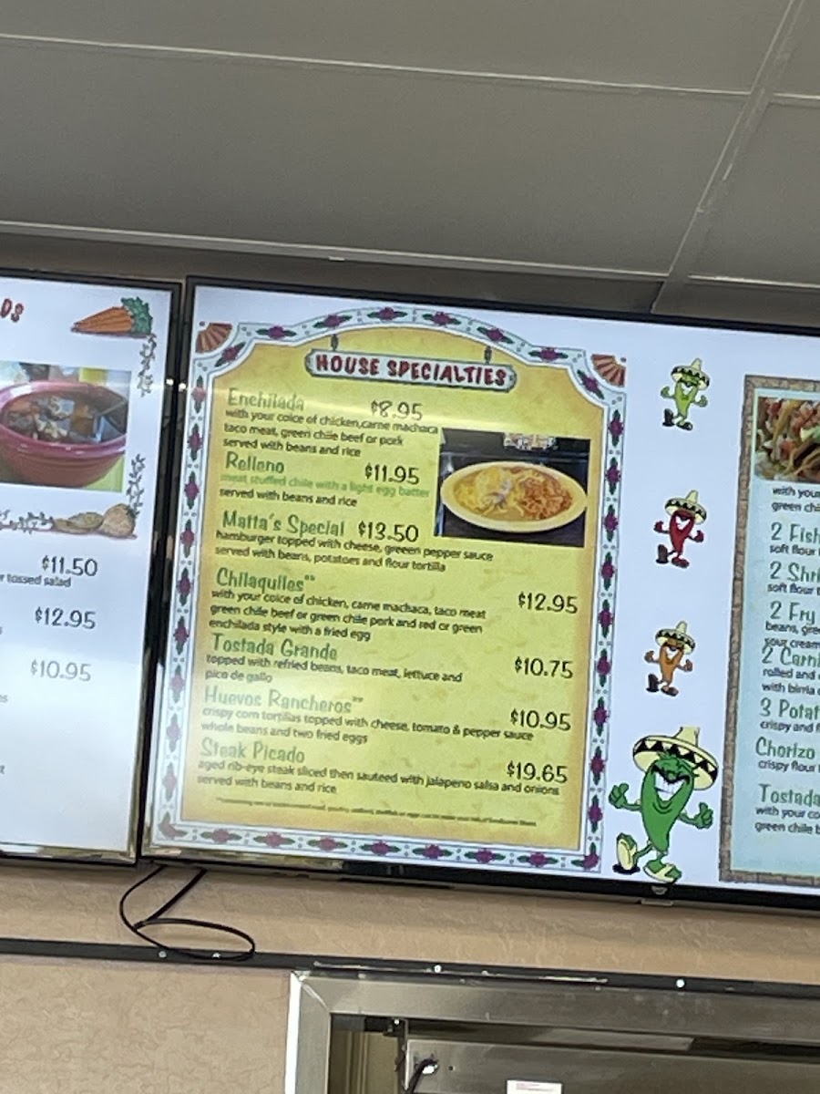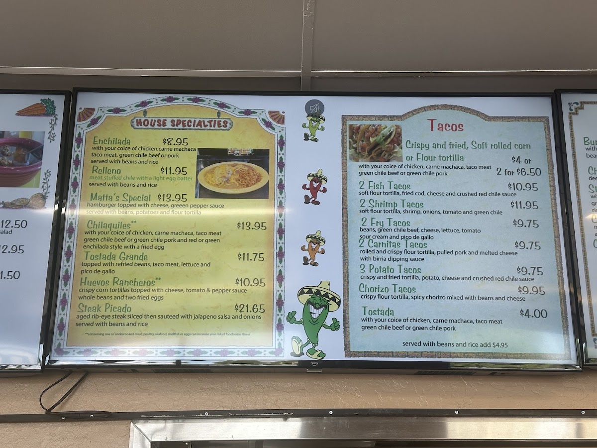 Matta's Mexican Food in Mesa offers a diverse and satisfying menu, packed with flavorful options for every palate. For those craving hearty, traditional dishes, the Enchilada and Huevos Rancheros stand out among the House Specialties, along with the delicious Chilaquiles and the Tostada Grande. Customers can also indulge in favorites like the Fiesta Combination and Sampler Plate from the Customer Favorites section, or enjoy combinations such as the #4 Combination and #6 Combination. For lighter bites, appetizers like the Nachos Suprema and Taquitos are perfect, while the Stuffed Quesadilla and Carne Asada Fries are great options for anyone looking for something a bit more substantial. The A La Carte section features sides like 8 Oz Rice, 8 Oz Beans, and Side Of Guacamole, all ideal for complementing your meal. The restaurant’s Chips & Salsa are a must-try, with options such as Large Chips paired with 16 Oz Chunky Salsa or Hot Sauce. If you're in the mood for a burrito, the Carnitas Burro, Fajita Burro, and Chimichanga are fantastic choices, while the Stuffed Burro is a crowd-pleaser. Tacos at Matta's come in various styles, including Chorizo Tacos, Carnitas Tacos, and even Fish Tacos, served either crispy, soft, or fried. For those preferring something more soupy or salad-based, the Albondigas Soup, Spanish Soup, and Taco Salad are wonderful, while the Fajita Salad and Burrito Bowls offer a fresh, satisfying option. Whether you’re in the mood for a light snack or a full meal, Matta's offers a little something for everyone, making it a go-to for authentic Mexican flavors in the area.